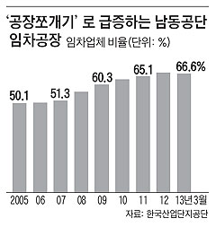 경기 침체로 지난해 남동공단의 생산액은 크게 줄었지만, 입주 업체와 고용 인원은 오히려 늘어났다. 2012년 남동공단 생산액은 22조91억원으로 전년도(24조4533억원)보다 10% 감소했다. 하지만 같은 기간 입주 업체는 6387개에서 6628개로 3.8%, 고용 인원은 8만1484명에서 8만5514명으로 5% 증가했다. 남의 공장을 빌려서 가동하는 임차 공장이 늘어났기 때문이다. 남동공단의 임차업체 수는 4454개로 전체의 67.2%에 달했다.